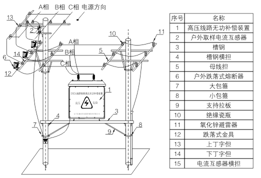 TBBZ系列高壓線路無功補償裝置主要由控制器,真空接觸器,電容器,電壓互感器,綜合保護器等組成。系統(tǒng)通過線路開啟式電流互感器采集線路電流信號,分析判斷線路無功功率缺失容量,控制電容器組的投切,使功率因數達到設定目標值。裝置采用戶外跌落式熔斷器對進行短路保護,一旦裝置有短路故障,跌落式熔斷器立即跳開,防止對裝置和線路造成損害。