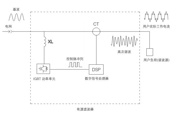有源濾波器通過CT實時檢測線路電流,并把被檢測到的諧波轉(zhuǎn)化為數(shù)字信號處理器中的控制信號。同時,數(shù)字信號處理器產(chǎn)生一系列脈寬調(diào)制信號,驅(qū)動IGBT功率模塊通過線路電抗器向電網(wǎng)輸出相位正好與電網(wǎng)諧波電流方向相反,而幅值大小相等的電流,兩種諧波電流正好相互抵消,從而達到濾除諧波、凈化電網(wǎng)電流的目的。
